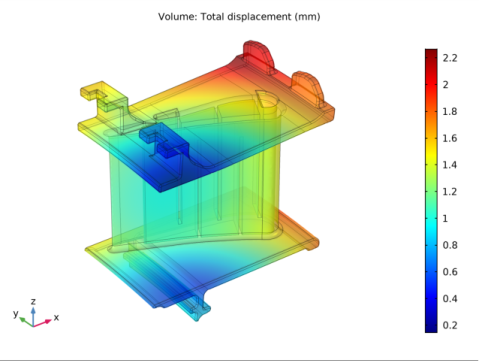 In the Settings window for Volume, click Replace Expression in the upper-right corner of the Expression section. From the menu, choose Component 1>Solid Mechanics>Displacement>solid.disp - Total displacement - m.