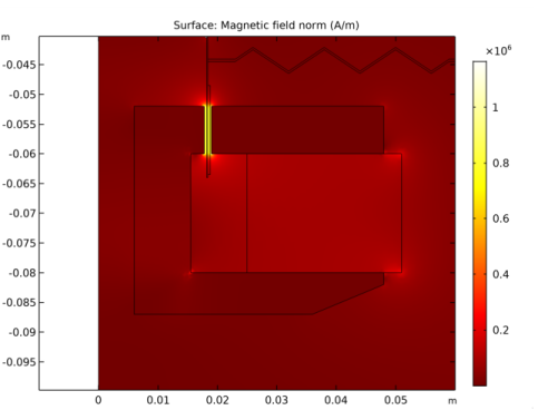 In the Settings window for Surface, click Replace Expression in the upper-right corner of the Expression section. From the menu, choose Component 1>Magnetic Fields>Magnetic>mf.normH - Magnetic field norm - A/m.