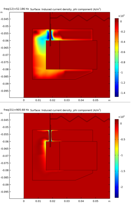 In the Settings window for Surface, click Replace Expression in the upper-right corner of the Expression section. From the menu, choose Component 1>Magnetic Fields>Currents and charge>Induced current density (spatial frame) - A/m²>mf.Jiphi - Induced current density, phi component.