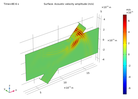 In the Settings window for Surface, click Replace Expression in the upper-right corner of the Expression section. From the menu, choose Component 1>Convected Wave Equation, Time Explicit>Acceleration and velocity>cwe.v_inst - Acoustic velocity amplitude - m/s.