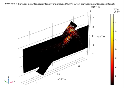 In the Settings window for Arrow Surface, click Replace Expression in the upper-right corner of the Expression section. From the menu, choose Component 1>Convected Wave Equation, Time Explicit>Intensity>cwe.Iix,...,cwe.Iiz - Instantaneous intensity.
