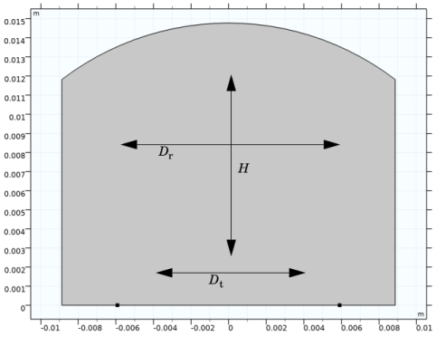 The levitator consists of a transducer of width Dt and a concave reflector of width Dr and curvature 1/R. The distance between the reflector and the transducer is H. The driving frequency of the system is f0 = 58 kHz and the system is filled with air at 20°C. The geometry is shown in Figure 1. Standard values for the dimensions of the levitator are given in Ref. 2 and are as follows in the model: