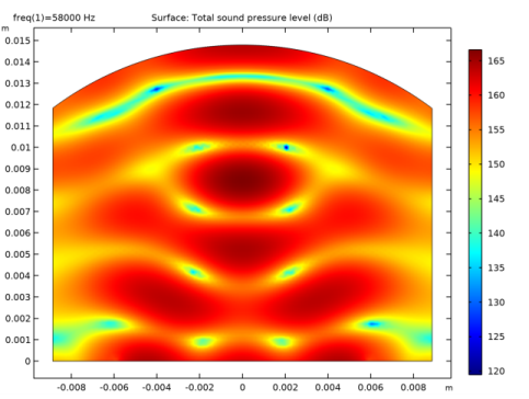 Note that the sound pressure level reaches as much as 166 dB SPL. Fortunately for the practical application of this device, this is outside the human auditory range. By tuning the amplitude of the normal acceleration of the transducer a0 (under parameters in the model tree), it is possible to determine the value at which the radiation force is no longer large enough to levitate the particles.