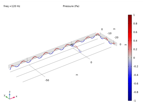 The problem can be solved in the frequency domain; the results will be equivalent to exciting the system in the time domain with a sine wave until you reach steady state. By solving the model in the frequency domain, a quick and inexpensive computation, insight into the pressure distribution for a given input can be obtained. Figure 7 shows the response of the pipe system under an excitation with a frequency of 120 Hz.