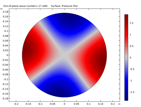 The Pressure Acoustics, Boundary Mode interface solves for the propagating and nonpropagating modes on the pipe cross section at the driving frequency to check if higher order modes propagate at the given frequency or if it just the plane wave component. A mode with a real wave number will propagate, while a mode with imaginary wave number will not be able to propagate. Figure 8 shows the pressure distribution for the mode (2,0) which cannot propagate at 120 Hz.