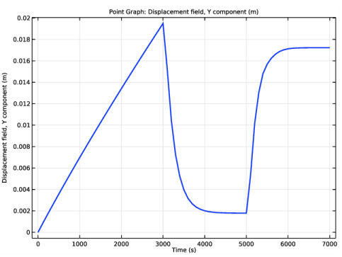 In the Settings window for Point Graph, click Replace Expression in the upper-right corner of the y-Axis Data section. From the menu, choose Component 1 (comp1)>Solid Mechanics>Displacement>Displacement field - m>v_solid - Displacement field, Y component.