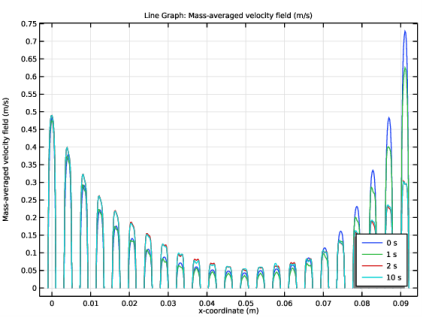 In the Settings window for Line Graph, click Replace Expression in the upper-right corner of the y-Axis Data section. From the menu, choose Component 1 (comp1)>Mixture Model, Laminar Flow>VelAndPressure>mm.U - Mass-averaged velocity field - m/s.