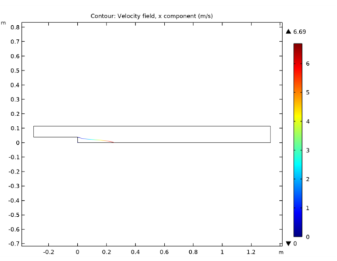 In the Settings window for Contour, click Replace Expression in the upper-right corner of the Expression section. From the menu, choose Component 1 (comp1)>Turbulent Flow, k-ε>Velocity and pressure>Velocity field - m/s>u - Velocity field, x component.
