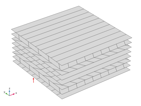 Modeling a composite laminated shell requires a surface geometry (2D), in general called a base surface, and a Layered Material node which adds an extra dimension (1D) to the base surface geometry in the surface normal direction. In the Layered Material node, you can model many layers stacked on top of each other having different thickness, material properties, and fiber orientations. You can also optionally specify the interface materials between the layers and control mesh elements in each layer.