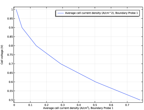 In the Settings window for Boundary Probe, click Replace Expression in the upper-right corner of the Expression section. From the menu, choose Component 1 (comp1)>Hydrogen Fuel Cell>fc.nIs - Normal electrode current density - A/m².