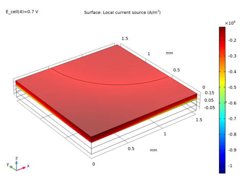 In the Settings window for Surface, click Replace Expression in the upper-right corner of the Expression section. From the menu, choose Component 1 (comp1)>Hydrogen Fuel Cell>Electrode kinetics>fc.iv_o2gder1 - Local current source - A/m³.