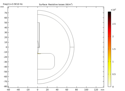 In the Settings window for Surface, click Replace Expression in the upper-right corner of the Expression section. From the menu, choose Component 1 (comp1)>Electromagnetic Waves, Frequency Domain>Heating and losses>emw.Qrh - Resistive losses - W/m³.