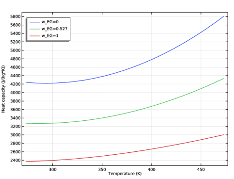 In the Settings window for Global, click Replace Expression in the upper-right corner of the y-Axis Data section. From the menu, choose Global definitions>Functions>HeatCapacityCppp1(temperature, pressure, massfraction_ethylene_glycol, massfraction_water) - Heat capacity (Cp) 1.