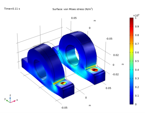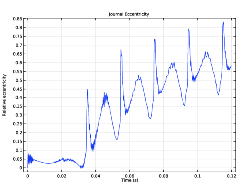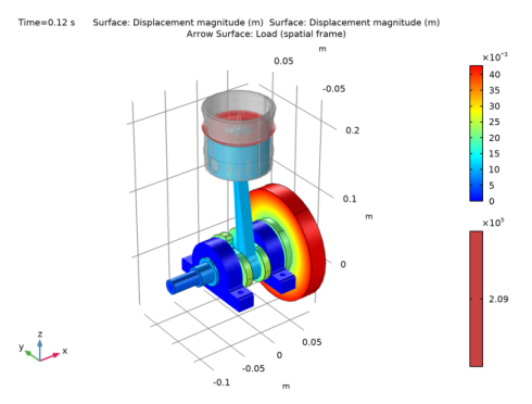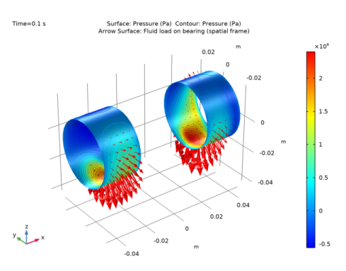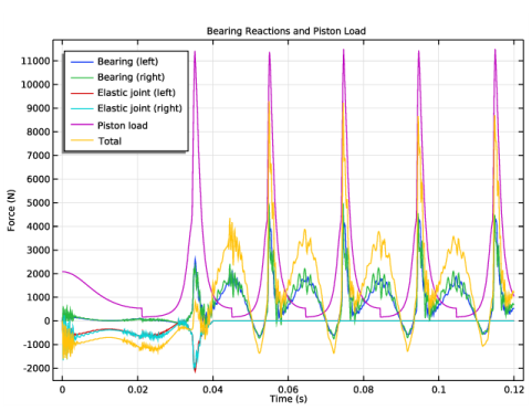 A Solid-Bearing Coupling multiphysics coupling is used to combine the engine-bearing assembly. The Hydrodynamic Journal Bearing in the Hydrodynamic Bearing physics interface is used to model the thin fluid film flow in the journal bearing. You need one such node per bearing.