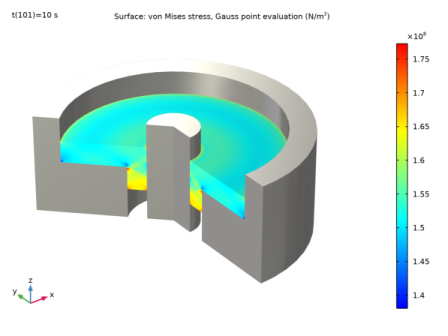 In the Model Builder window, expand the Results>Stress, 3D (solid) node, then click Stress, 3D (solid).