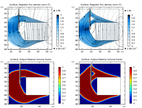 In the Model Builder window, expand the Results>Topology Optimization node, then click Results>Magnetic Flux Density Norm (mf2).