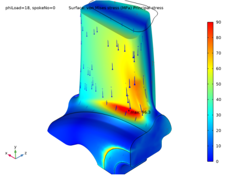 The total load carried by the wheel corresponds to a weight of 1120 kg. It is applied as a pressure on the rim surfaces where the tire is in contact. Assume that the load distribution in the circumferential direction can be approximated as p = p0 cos ( 3 ϑ ), where ϑ is the angle from the point of contact between the road and the tire. The loaded area thus extends 30° in each direction from the peak of the load. Four different load cases are analyzed, where the center of the peak load is rotated 18° each time. In this way the whole load cycle for the rotating wheel can be covered. The pressure load and the load distribution carried by the wheel are shown in Figure 2.