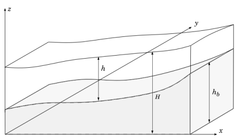 Assuming that the water depth h is much smaller than the lateral dimensions of the geometry, the vertical accelerations can be neglected,