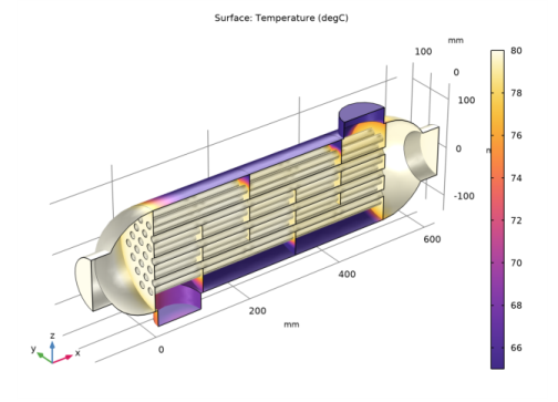 The Heat Exchangers section in the Application Library presents several heat exchangers of different sizes, flow arrangements, and flow regimes. They benefit from the predefined Conjugate Heat Transfer interface that provides ready-to-use features for couplings between solids, shells, and laminar or turbulent flows. The simulation results show properties of the heat exchangers, such as their efficiency, pressure loss, or compactness.