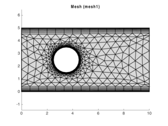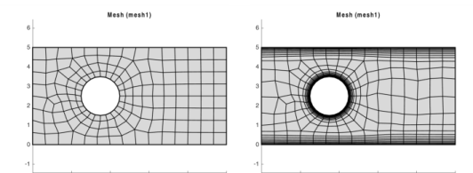 For 2D and 3D geometries it is also possible to create boundary layer meshes using the BndLayer feature. A boundary layer mesh is a mesh with dense element distribution in the normal direction along specific boundaries. This type of mesh is typically used for fluid flow problems to resolve the thin boundary layers along the no-slip boundaries. In 2D, a layered quadrilateral mesh is used along the specified no-slip boundaries. In 3D, a layered prism mesh or hexahedral mesh is used depending on whether the corresponding boundary layer boundaries contain a triangular or a quadrilateral mesh.