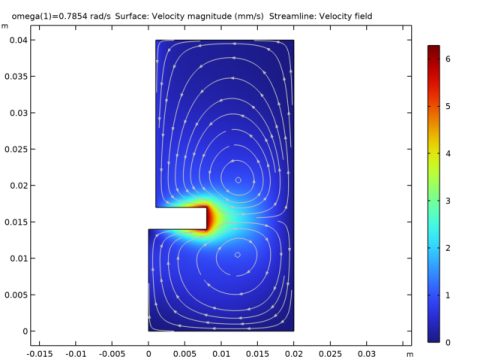 Figure 3: Results for angular velocity ω= 0.25π rad/s. The surface plot shows the magnitude of the velocity field and the white lines are streamlines of the velocity field.