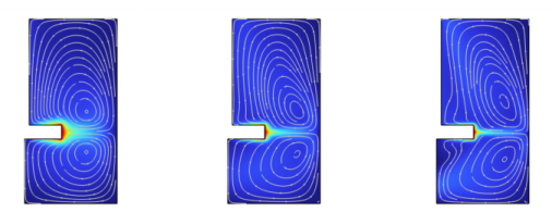 The shape of the two recirculation zones, which are visualized with streamlines, changes as the angular velocity increases. Figure 4 shows the streamlines of the velocity field for higher angular velocities.