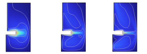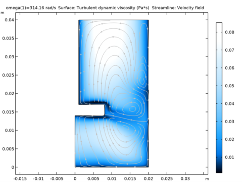 Figure 7 shows the turbulent viscosity and flow fields for the angular velocity for ω = 500π rad/s when the flow in the mixer volume is developed.