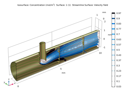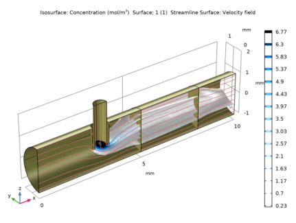 In the Model Builder window, expand the Concentration, c_C, Isosurface node, then click Isosurface 1.