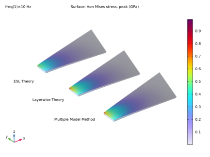 The multiple model method combines the aforementioned modeling approaches, and in order to combine the Layered Shell and Shell interfaces in the thickness direction, a Layered Shell-Shell Connection multiphyics coupling must be used. You must also use the Layered Material Stack node for the through-thickness coupling between the interfaces.