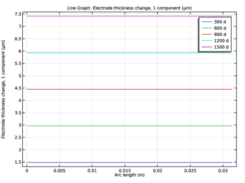 In the Settings window for Line Graph, click Replace Expression in the upper-right corner of the y-Axis Data section. From the menu, choose Component 1 (comp1)>Tertiary Current Distribution, Nernst-Planck>Dissolving-depositing species>Electrode thickness change - m>tcd.sb_oxide - Electrode thickness change, 1 component.