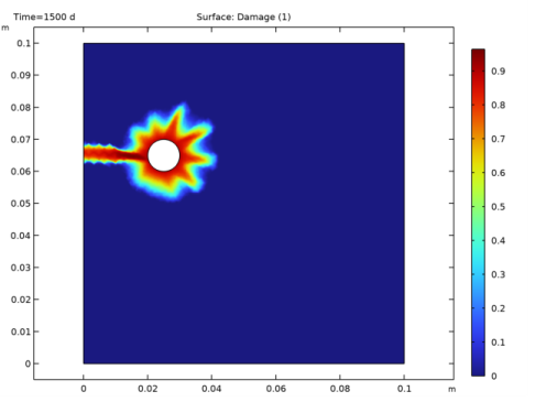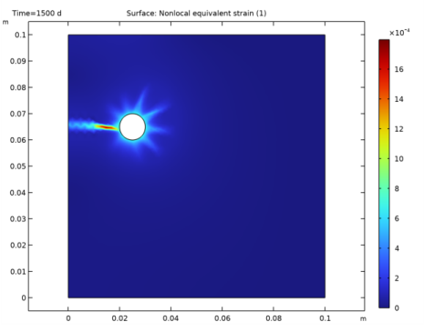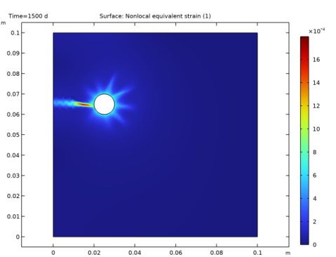 In the Settings window for Surface, click Replace Expression in the upper-right corner of the Expression section. From the menu, choose Component 1 (comp1)>Solid Mechanics>Damage>solid.eeqnl - Nonlocal equivalent strain.