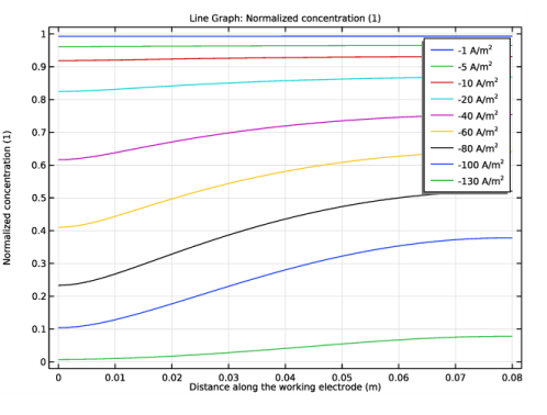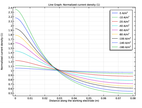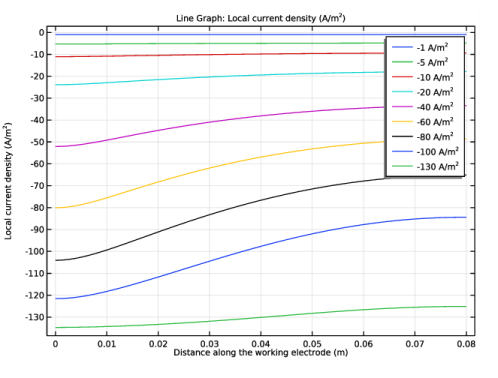 In the Settings window for Line Graph, click Replace Expression in the upper-right corner of the y-Axis Data section. From the menu, choose Component 1 (comp1)>Secondary Current Distribution>Electrode kinetics>cd.iloc_er1 - Local current density - A/m².