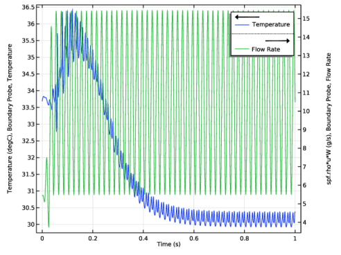 In the Model Builder window, expand the Temperature and Flow Rate node, then click Probe Table Graph 1.