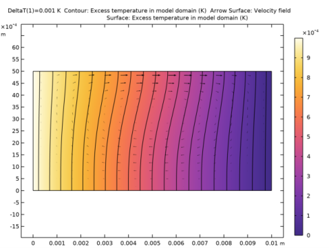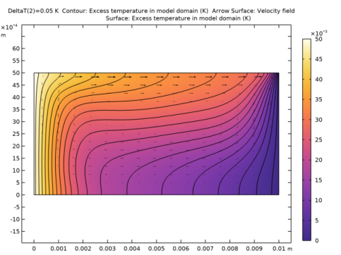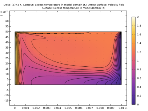 In the Settings window for Contour, click Replace Expression in the upper-right corner of the Expression section. From the menu, choose Component 1 (comp1)>Definitions>Variables>deltaT - Excess temperature in model domain - K.