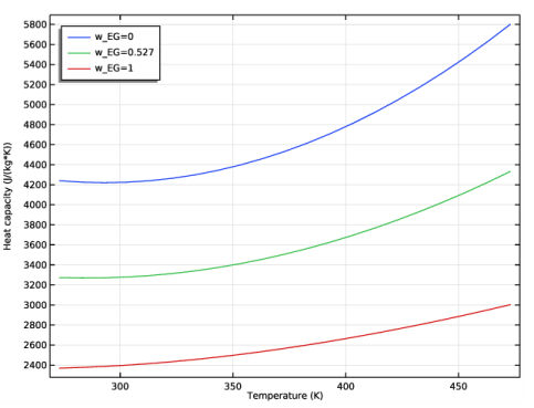 In the Settings window for Global, click Replace Expression in the upper-right corner of the y-Axis Data section. From the menu, choose Global definitions>Functions>HeatCapacityCppp1(temperature, pressure, massfraction_ethylene_glycol, massfraction_water) - Heat capacity (Cp) 1.