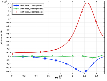 Click Add Expression in the upper-right corner of the y-Axis Data section. From the menu, choose Component 1 (comp1)>Multibody Dynamics>Hinge joints>Hinge Joint 2>Joint force - N>mbd.hgj2.Fz - Joint force, z component.