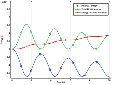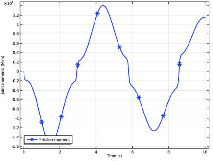 In the tree, select Component 1 (Comp1)>Multibody Dynamics (Mbd)>Hinge Joint 3>Friction 1 and Component 1 (Comp1)>Multibody Dynamics (Mbd)>Energy: Friction.