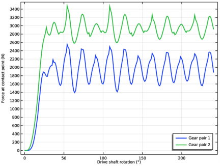 The contact force on a Gear Pair is computed using Weak constraints or Penalty method. By default, the contact force computation is turned off. Use the weak constraints method for more accurate contact forces. However, you preferably opt for the penalty method for large rigid body systems.