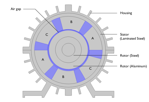 The 2D geometry of the induction motor is the cross section of the 3D geometry. The length of the 2D geometry in the out-of-plane direction in the Rotating Machinery interface is set to the length of the rotor in the 3D geometry.
