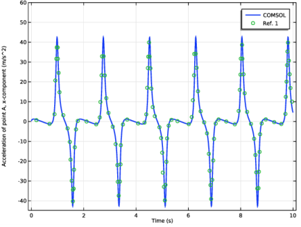 In the Settings window for Point Graph, click Replace Expression in the upper-right corner of the y-Axis Data section. From the menu, choose Component 1 (comp1)>Multibody Dynamics>Acceleration and velocity>Acceleration - m/s²>mbd.u_ttX - Acceleration, X component.