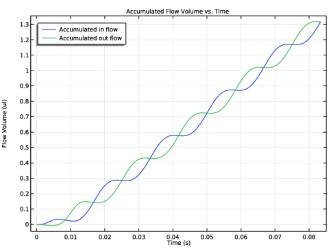 In the Settings window for 1D Plot Group, type Accumulated Flow Volume vs. Time in the Label text field.