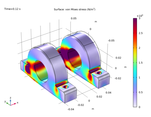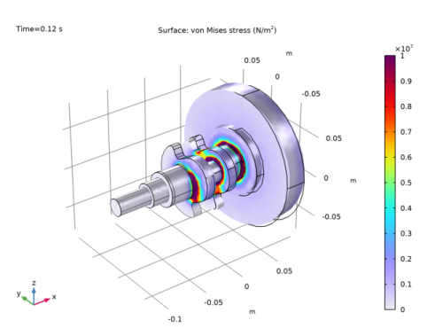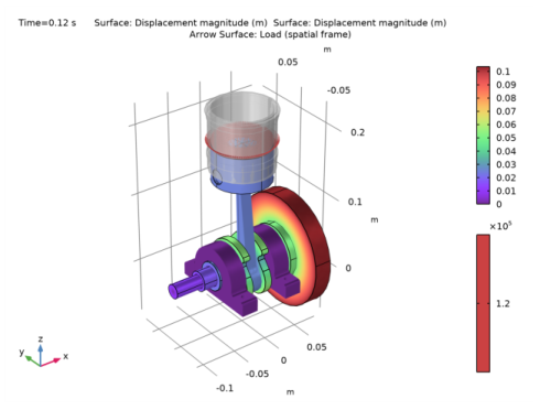 Figure 3 shows a plot of the stress profile in the crankshaft at t = 0.12 s. The maximum stress occurs in the crank due to the bending of the crankshaft.