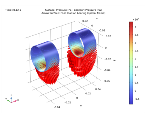 The pressure profile in the bearings at t = 0.12 s is shown in Figure 4. The skewed pressure distribution in the bearings due to the bending of the shaft is clearly visible.