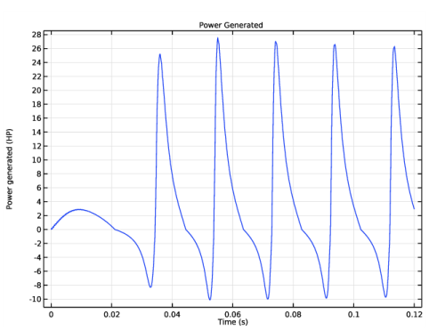 The mechanical power generated by the gas pressure is displayed in Figure 9. During the compression stroke, the power generated is negative and suddenly reverts its sign during the combustion, after which the power generated is positive. The time average of the power over a cycle is the net mechanical power generated in one revolution of the crankshaft.