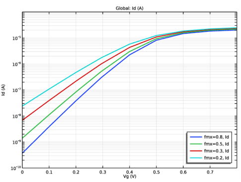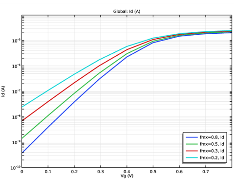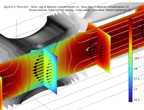 In the Settings window for Arrow Volume, click Replace Expression in the upper-right corner of the Expression section. From the menu, choose Component 1 (comp1)>Semiconductor>Currents and charge>semi.JX,...,semi.JZ - Total current density, nodal value.