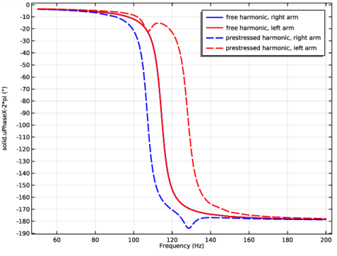 Click Replace Expression in the upper-right corner of the y-Axis Data section. From the menu, choose Component 1 (comp1)>Solid Mechanics>Displacement>Displacement phase (material and geometry frames) - rad>solid.uPhaseX - Displacement phase, X component.