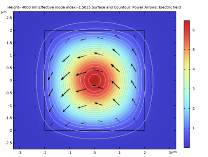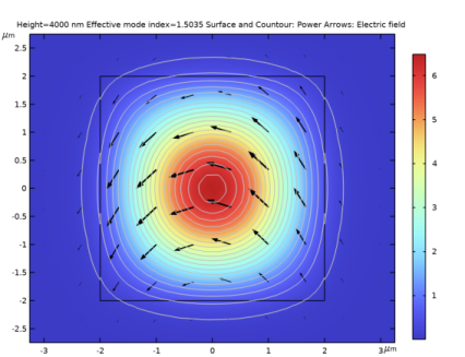 In the Title text area, type Height=eval(height,nm) nm Effective mode index=eval(ewfd.neff) Surface and Countour: Power Arrows: Electric field.