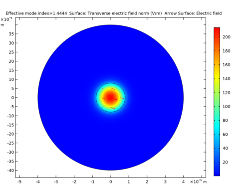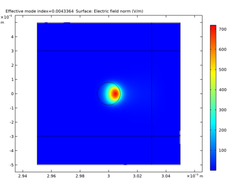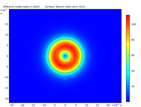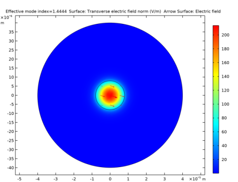 In the Settings window for Surface, click Replace Expression in the upper-right corner of the Expression section. From the menu, choose Straight Fiber (comp1)>Definitions>Variables>normEt - Transverse electric field norm - V/m. This is the variable we added in a previous step. It is clear that the plot looks almost identical to the plot of the norm of the electric field, verifying that the electric field is predominantly polarized in the transverse direction (the xy-plane).