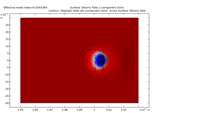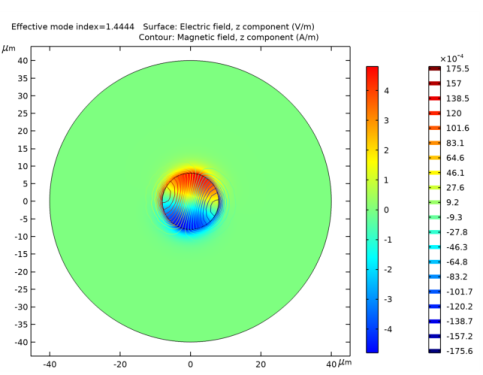 In the Settings window for Contour, click Replace Expression in the upper-right corner of the Expression section. From the menu, choose Straight Fiber (comp1)>Electromagnetic Waves, Frequency Domain>Magnetic>Magnetic field - A/m>ewfd.Hz - Magnetic field, z component.