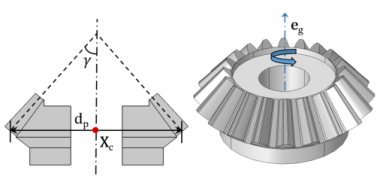The additional parameter cone angle (γ) is required to define a bevel gear. The positive cone angle results in a decrease in diameter along the gear axis.
